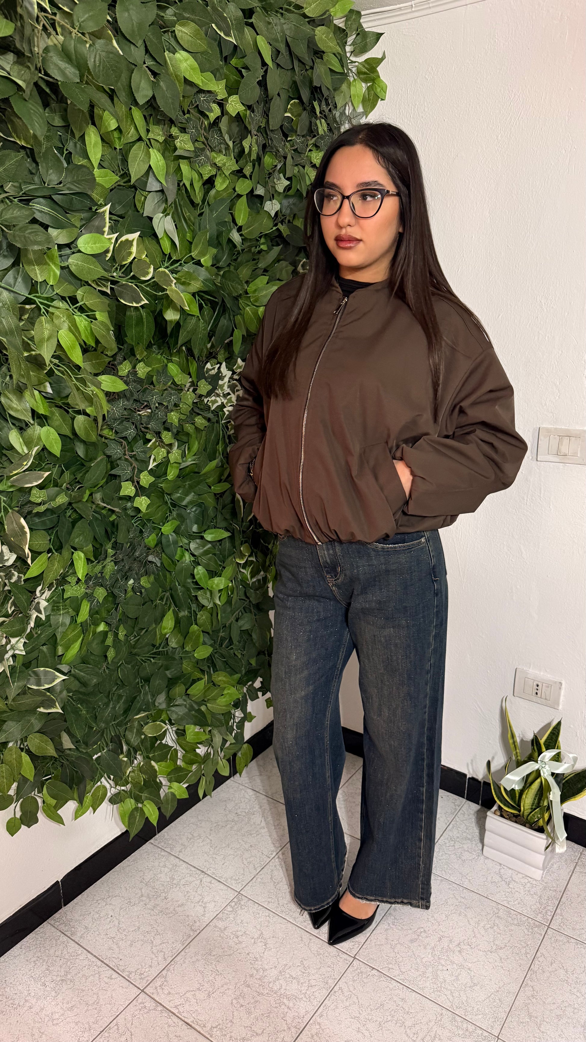 La modella in foto indossa una S, veste solitamente una 40/42 ed è alta 160cm.
