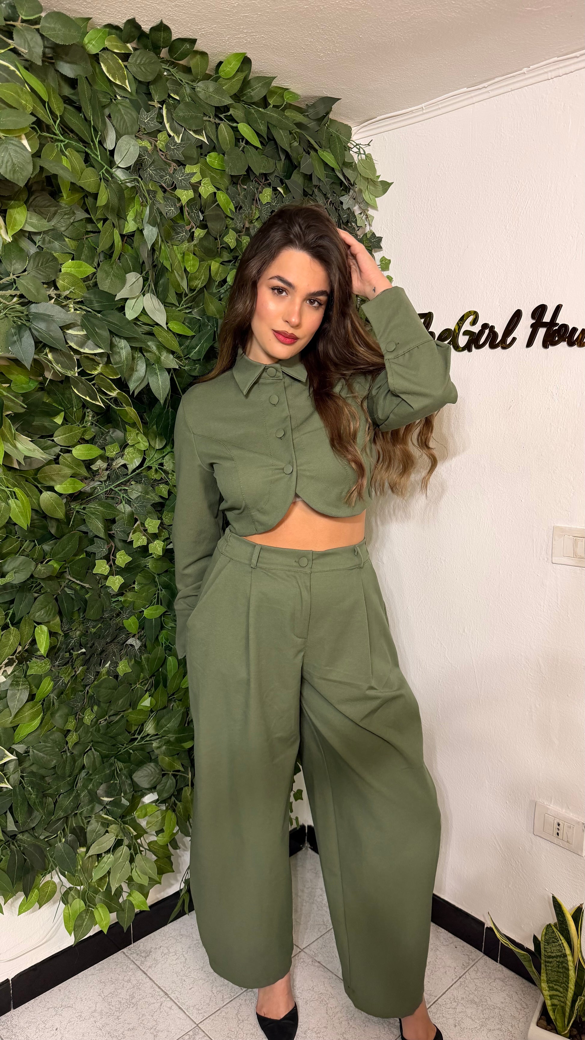 Coordinato con giacca crop con bottoni frontali e pantalone a vita alta con molla elasticizzata sul retro.