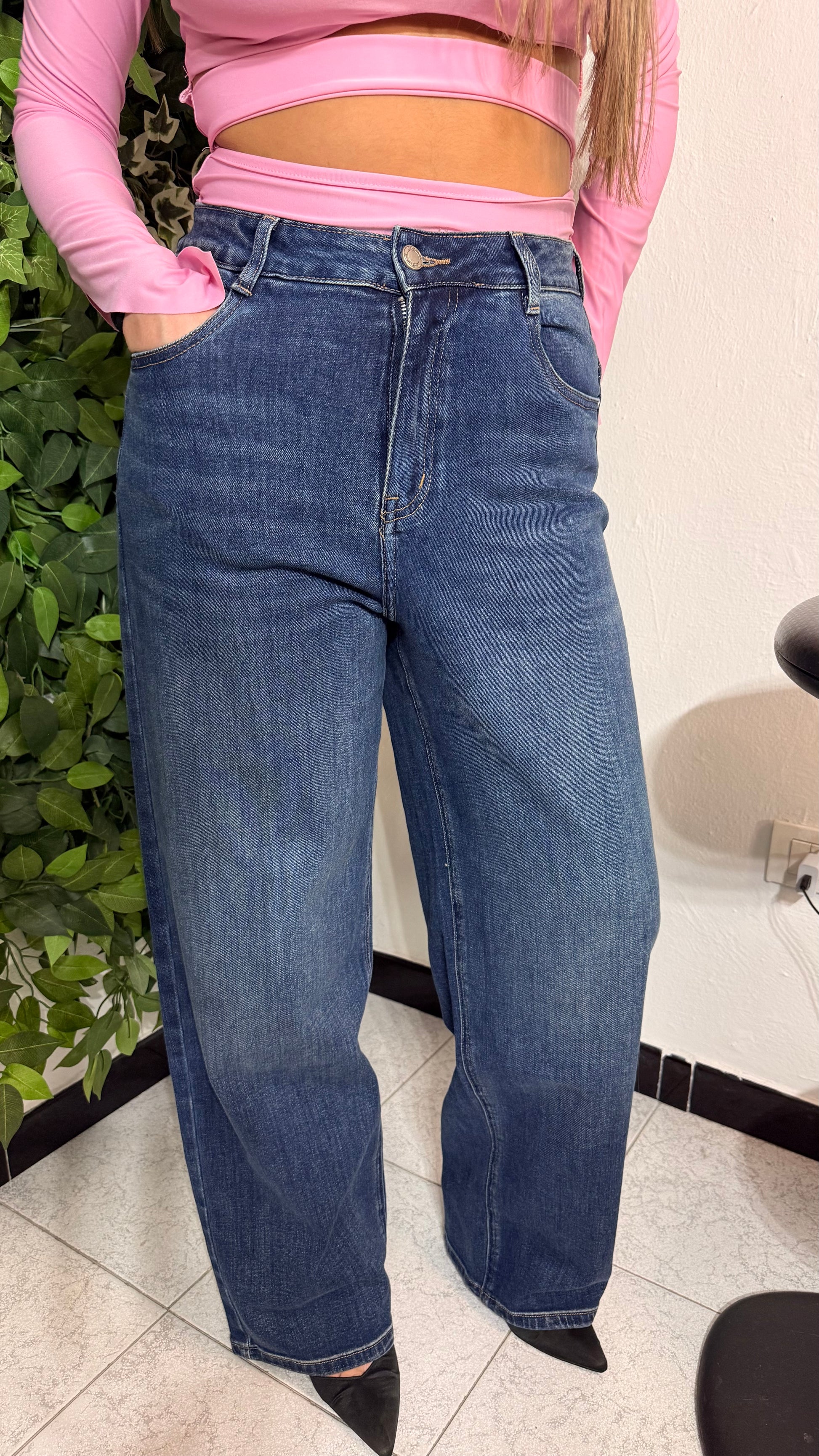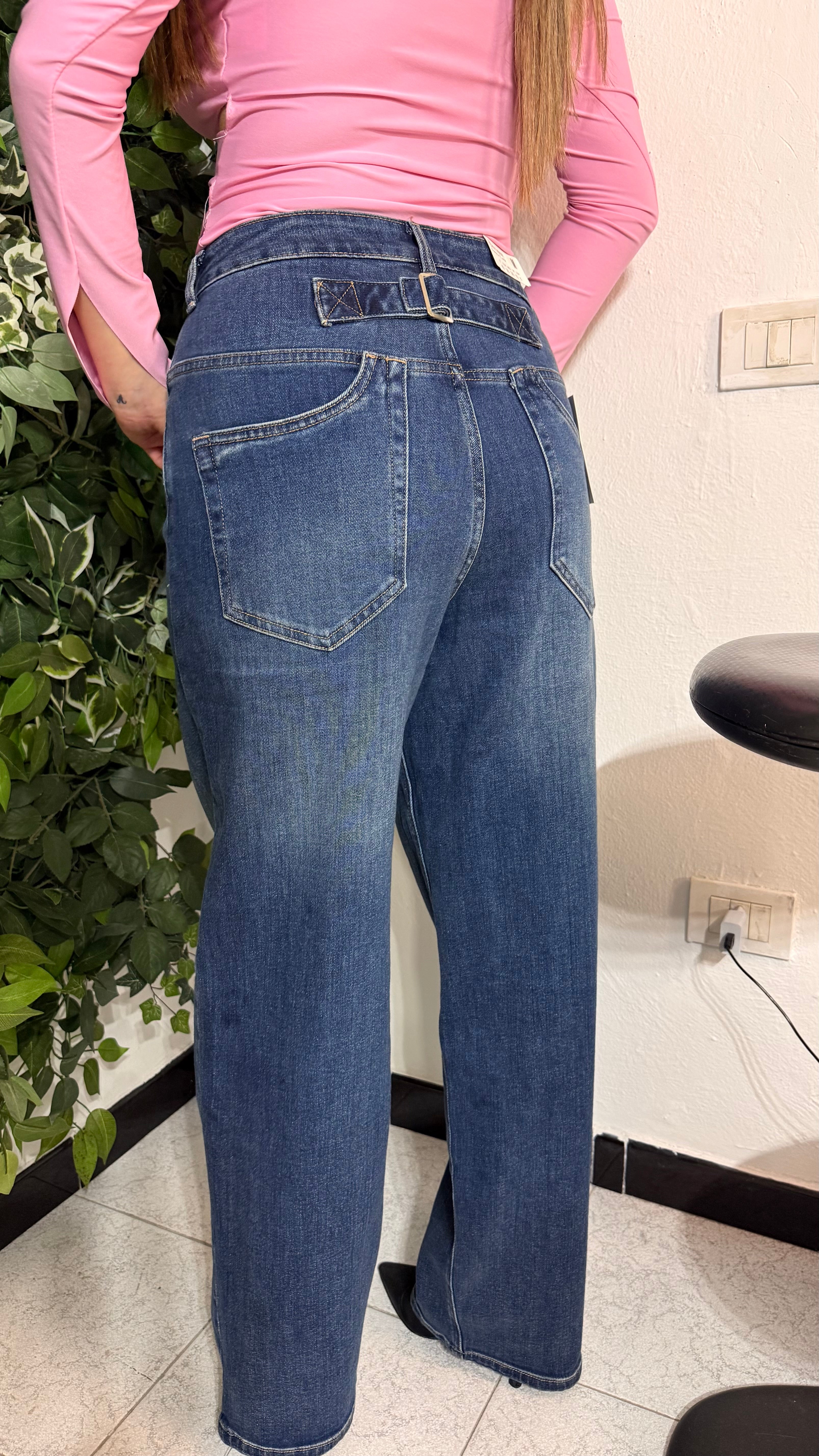 Jeans elasticizzato con cinturino sul retro.